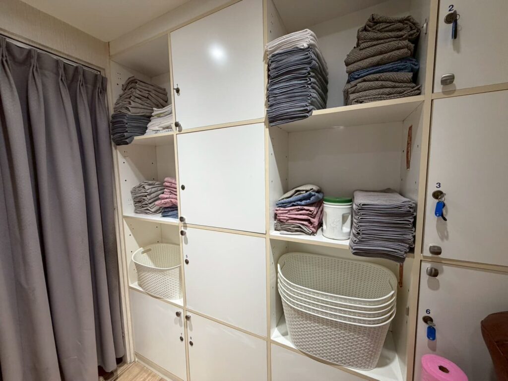 更衣室にあるタオルやズボンもきっちり畳まれていて、整理整頓へのこだわりがうかがえます。